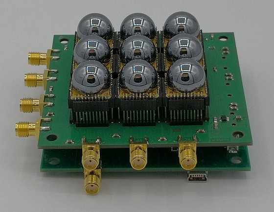Currently, we are building the first ever THz light-field camera prototype - which consists of a 3x3 super-array of lens coupled 1k-pixel THz CMOS cameras - in a single package. The CMOS camera chip is presented in the International Solid-State Circuits Conference (ISSCC) 2021. The figure shows the prototype of the light field array. The prototype serves as the hardware platform for the development of light-field based real-time THz 3-D imaging techniques.